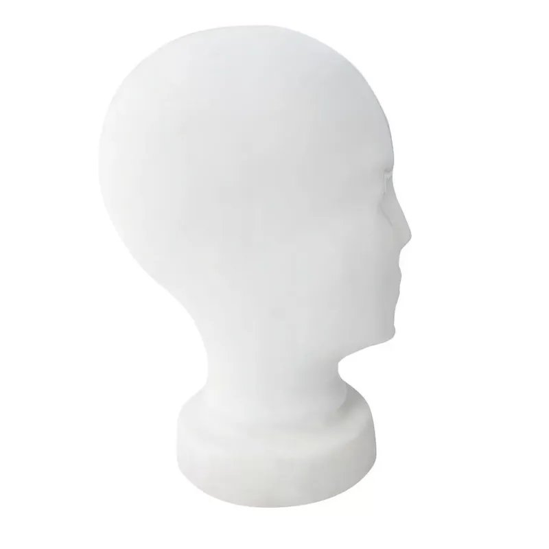 Cabeza de porcelana blanca H.R.P, diseñada para la creación precisa de calotas o calvas profesionales, así como para la sujeción estable de pelucas durante su manipulación o diseño.