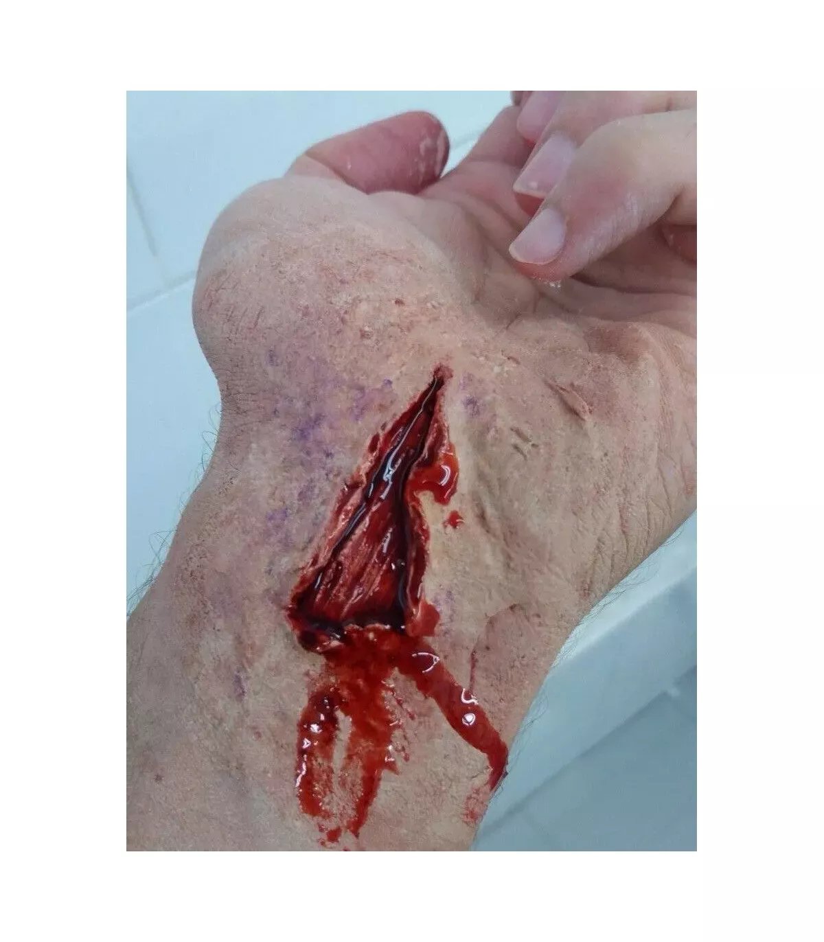 Añade realismo extremo a tu caracterización con esta prótesis de látex con herida corte abierto 2 de H.R.P. Diseñada para maquillaje de Halloween, cine, teatro o efectos especiales, esta pieza reproduce diferentes tipos de cortes abiertos en la piel con gran detalle.