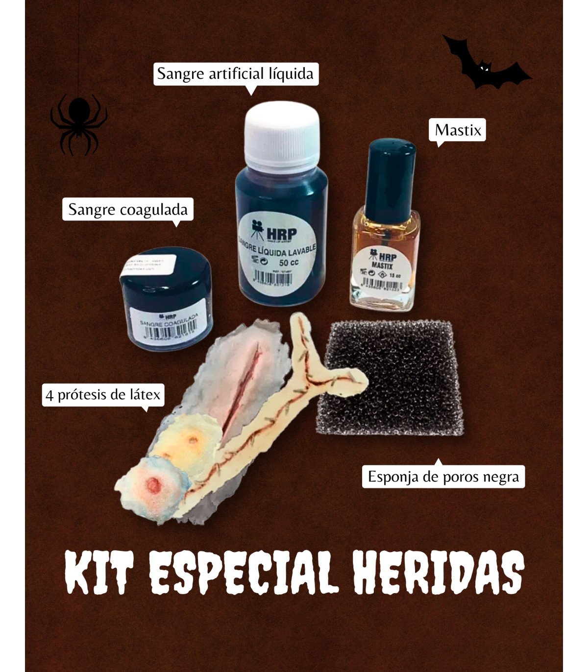 Kit de maquillaje de Halloween con prótesis y sangre falsa para crear heridas realistas. Incluye adhesivo Mastix, sangre líquida y coagulada, prótesis de látex y esponja de poros. Ideal para fiestas, teatro y Halloween.