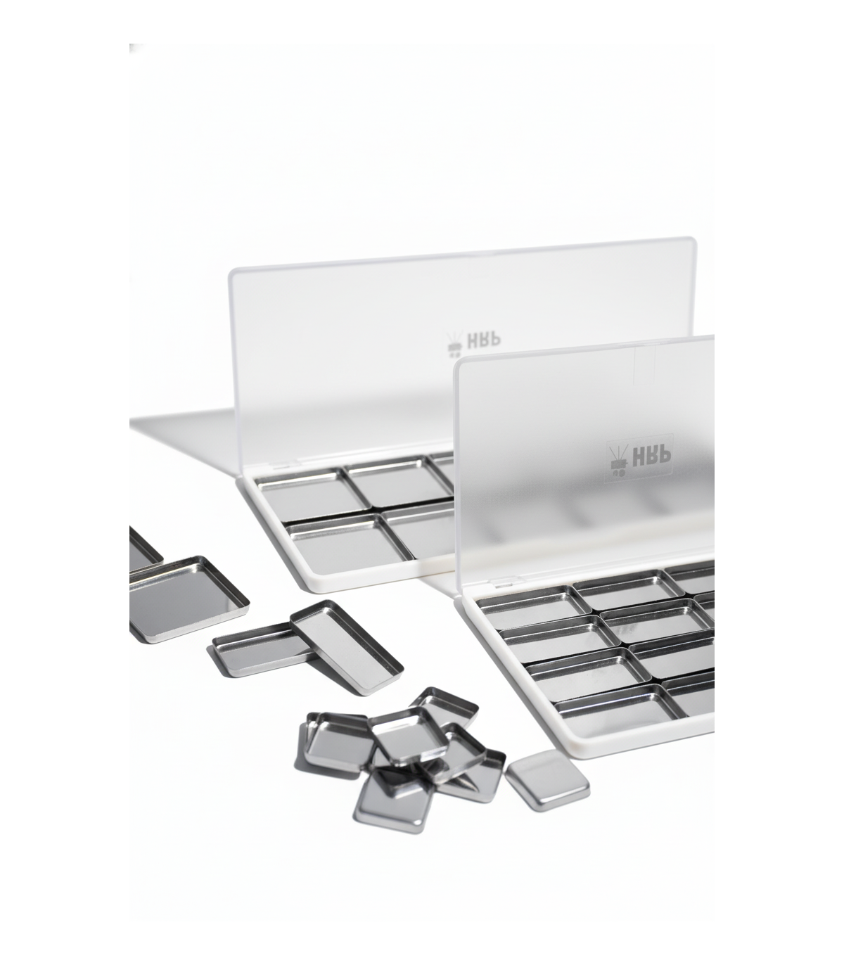 Godet metálico rectangular diseñado para el trasvase y organización de productos de maquillaje. Fabricado en metal resistente. Compatible con paletas magnéticas y sistemas de depotaje como paletas con huecos ya establecidos.